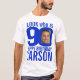 90th birthday blue and white, look who is 90 custom photo and name t-shirt. Fun 90th personalised photo royal bright blue and white birthday tee design. Personalise this birthday shirt with a photograph of the birthday boy or girl in the middle of the number 0. Great idea for adding some fun to a milestone ninetieth birthday. Other matching items and colours are available. Exclusive design by Sarah Trett for www.mylittleeden.com