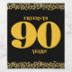 A 90th birthday celebration featuring a chunky retro modern 90 in a gold glitter pattern with speckled gold confetti border over a black background.