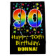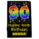 This vibrant, exciting, and colourful birthday themed gift bag design features a large number "90" with a rainbow spectrum gradient inspired pattern, along with the message "Happy 90th Birthday,", and a custom recipient name. It also has a colourful background pattern featuring variously-sized star shapes. A gift bag like this might be used when giving a gift or present in honour of somebody’s 90th birthday. [~Z0000510]