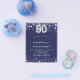 A modern, stylish and glamourous invitation for a 90th birthday party. A navy blue background, decorated with faux silver stars. Personalise and add your name and party details. Number 90 is written with a balloon style font.