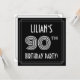 The front of this 1920s-1930s style inspired ninetieth birthday party invitation card design features a customisable name, an intricate art deco look inspired number “90th”, the message “BIRTHDAY PARTY!”, and a multi-line border. There is a black-coloured background on the front by default, but it can be customised to a different colour if desired. The back features personalised details about the event, such as the date, time, venue/location, and any other important information. Luxurious, stylish, editable invitations like these might be used to invite guests to a birthday party being held to celebrate somebody’s 90th birthday. [~Z0000615]