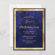 On front: A trendy, modern 90th birthday party invitation card for men. A dark blue, navy blue background. The blue colour is uneven. With a faux gold frame and golden confetti, golden coloured letters. Templates for your party information. Back: white background.