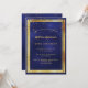 A trendy, modern 90th birthday party invitation card for men, guys, male. A dark blue, navy blue background. The blue color is uneven. With a faux gold frame and golden confetti sprinkle, golden colored letters. Templates for your party information.