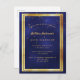 A trendy, modern 90th birthday party invitation card for men, guys, male. A dark blue, navy blue background. The blue colour is uneven. With a faux gold frame and golden confetti sprinkle, golden coloured letters. Templates for your party information.