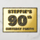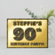 The front of this bold ninetieth birthday party/celebration foil invitation card features a personalised name, a large number “90th”, the message “BIRTHDAY PARTY!”, and a border, all featuring a rustic, yet sophisticated, faux wood grain appearance inspired pattern. The back features personalised details about the event, such as the date, time, place/venue, and any other information that may be useful. Editable invitations like these might be used to invite guests to a birthday gathering being held to celebrate somebody’s 90th birthday. [~Z0000595]