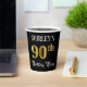 This opulent and fancy birthday paper cup design features a personalised name and the message “90th Birthday Party”. The large number “90th” has a faux/imitation gold-inspired colouring pattern, and the words “Birthday Party” are in luxurious script-style text. The background is coloured black by default (although it can be customised). Ornate, luxurious paper cups like this might be useful to have at a birthday party being held to celebrate somebody’s ninetieth birthday. [~Z0000567]