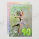 A beautiful ballerina flower fairy dancing on a birthday party invitation. The ballerina is wearing a white tutu, and has trails of flowers coming from her hair. She is dancing through a meadow full of daisies.