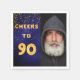 A napkin for guys 90th birthday party. Template for your photo. Dark blue background and the tex: Cheers to 90. The text is written with a trendy faux gold balloon script. The dark blue colour is uneven. With golden confetti as decor.