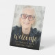 This custom 90th birthday party welcome sign features the guest of honour's personalised photo, name, and birthday, along with the word "welcome" in elegant gold-coloured calligraphy script. A dark screen helps make the text pop. A great way to celebrate someone who's turning ninety!