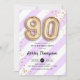 90th birthday party invitation. Elegant design in faux glitter gold with pastel purple and white stripes. Invite card with gold number 90 balloons, script font with confetti. Perfect for a stylish bday celebration. Message me if you need custom age.