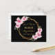 On front: Trendy tropical style. With a faux gold geometric frame decorated with pink hibiscus, flowers tropical florals with some greenery. A chic black background. Templates for a name and date. Golden letters. The name and the text: Save the Date are written with a modern hand lettered style script.
