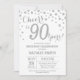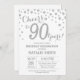 90th Birthday Invitation with Silver Glitter Diamond Background. Silver Confetti. Adult Birthday. Male Men or Women Birthday. For further customisation, please click the "Customise it" button and use our design tool to modify this template.