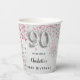 For a glamourous and girly for a 90th birthday party. A faux silver looking background. On the front and the back: Personalise and add a name, and a date. Decorated with pink and faux silver glitter dust. Number 90 is written with a balloon style font.