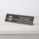 Desk name plate featuring a dispatcher badge with black banner and a thin gold line. Edit the text for a one of a kind gift for your favourite 911 emergency services dispatcher.
