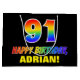 This cheerful, fun, and colourful birthday gift bag design features a large number "91" and the message "HAPPY BIRTHDAY,", both having a rainbow spectrum gradient inspired pattern colouring, along with a bold yellow custom recipient name. The background is coloured black. A fun birthday themed gift bag like this may be used to wrap a gift or present being given to celebrate somebody’s 91st birthday. [~Z0000477]