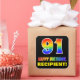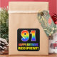This colourful, fun, and cheerful birthday sticker design features a large number "91" and the message "HAPPY BIRTHDAY,", both having a rainbow spectrum gradient inspired pattern colouring, along with a bold yellow customisable name. The background is coloured black. Fun stickers this might be used when wrapping a gift or present in honour of somebody’s 91st birthday, or perhaps might be handed out to the guests at a birthday celebration. [~Z0000480]
