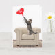 Tabby cat standing on a leather chair playing with a red heart balloon for 91st birthday.
