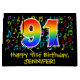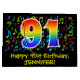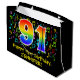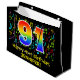 This fun, vibrant, and colourful birthday-themed gift bag design features a large number "91" with a rainbow spectrum gradient inspired pattern, along with the message "Happy 91st Birthday,", and a personalised name. Part of the background has a colourful music notes and symbols pattern. A gift bag like this might be a fun way of wrapping a birthday present or gift being given to a music composer, a singer, a musician, or somebody else who is celebrating their ninety first birthday. [~Z0000425]