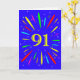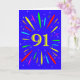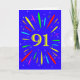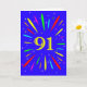 An explosive 91st birthday card! What a wonderful way to send birthday greetings. The number 91 in bright yellow with an explosion of bright colours and stars.