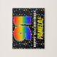 This fun and eye-catching birthday-themed jigsaw puzzle design features a large number “91” with a multicolored rainbow spectrum inspired gradient pattern, along with the message “HAPPY 91st BIRTHDAY,”, and an editable recipient name. The background has an exciting, colourful stars pattern. A cheerful, customisable birthday puzzle like this might be used to celebrate somebody’s ninety-first birthday. [~Z0000607]