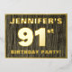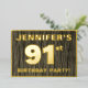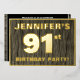 The front of this bold ninety-first birthday party/celebration foil invitation card features a customisable name, a large number “91st”, the message “BIRTHDAY PARTY!”, and a border, all in foil. The background of the front features a rustic, yet sophisticated, faux wood grain look inspired pattern. The back features personalised details about the event, such as the date, time, venue/location, and any other useful information. Customised invitations like these might be used to invite guests to a birthday party/gathering being held to honour somebody’s 91st birthday. [~Z0000598]