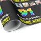 This bold and eye-catching birthday themed wrapping paper design features a large number “91“ having a vibrant multicolored rainbow spectrum inspired gradient pattern, along with the message “Happy 91st Birthday,“ and an editable recipient name. There are also photos that can be personalised, perhaps with photos of the recipient, the recipient’s family and friends, and/or the sender(s) of the gift. Upbeat birthday themed wrapping paper like this might be used when giving a gift or present in celebration of somebody’s ninety-first birthday. (Photography © Storytree Studios, Stanford, CA.) [~Z0000670]