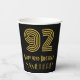 This vintage style and 1920s/1930s style inspired birthday-themed paper cup design features a large art deco inspired look number “92”, plus the birthday greeting message “Happy 92nd Birthday,” and a personalised name. The background is coloured black. Birthday themed paper cups like this might be used at a party celebrating somebody’s 92nd birthday. [~Z0000546]