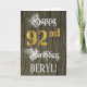 The front of this luxurious and elegant birthday-themed greeting card design features the message “Happy 92nd Birthday,”, and a personalised recipient name. Part of the message is in elaborate script-style text, the large number “92nd” features a faux/imitation gold-inspired look pattern, and the background has an imitation/faux woodgrain-inspired pattern. The inside has a custom birthday greeting message, or could perhaps be cleared and left blank if a message is to be written by hand instead. An ornate, customisable birthday greeting card like this might be sent in celebration of somebody’s ninety-second birthday. [~Z0000561]