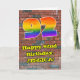This exciting and vibrant urban street art and graffiti themed birthday greeting card design features a large number “92” with a colourful rainbow spectrum gradient inspired pattern, along with the message “Happy 92nd Birthday,”, and a personalised name. The background of the front has a brick wall pattern. The inside has a customisable birthday greeting message, or could perhaps be cleared and left blank if a message is to be written by hand instead. A vibrant, customised birthday greeting card like this might be a fun way to send some birthday wishes to somebody who is celebrating their ninety-second birthday. [~Z0000586]