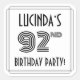 This luxurious and Roaring Twenties inspired ninety-second birthday party square sticker design features a custom name, an intricate art deco style inspired number “92nd”, the message “BIRTHDAY PARTY!”, and a border pattern consisting of lines. Stickers like these might be used when celebrating somebody’s 92nd birthday. [~Z0000618]