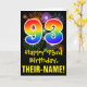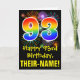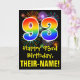 The front of this exciting, fun, and colorful birthday themed greeting card design features a large number "93" having a rainbow spectrum gradient inspired pattern. It also features the message "Happy 93rd Birthday,", and a custom recipient name. The front additionally features a colorful background pattern inspired by the look of bursting celebratory fireworks. The inside features an editable birthday greeting message, or could perhaps be cleared and left blank if a message is to be written by hand instead. A customizable birthday card like this might be a fun way to acknowledge somebody’s ninety third birthday. [~Z0000442]