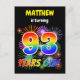 The front of this fun and lively birthday party invitation postcard design features a personalised name, a vibrant bursting celebratory fireworks inspired pattern, and the message "93 YEARS OLD!" having a colourful rainbow spectrum inspired gradient pattern. The back features a personalised message that could include details about the birthday party, such as when it is happening and where it is being held. Invitation postcards like this could be sent to potential guests of a birthday party being held to celebrate somebody’s ninety third birthday. [~Z0000452]