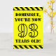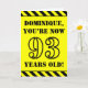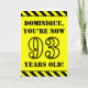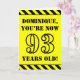 The front of this attention-grabbing and fun birthday-themed greeting card design features an editable name and the message "YOU’RE NOW 93 YEARS OLD!" in black stencil style text on a yellow coloured background. The front also features an eye-catching black and yellow striped pattern at the top and bottom edges. The inside features a customisable birthday greeting message, or could perhaps be cleared and left blank if a message is to be written by hand instead. A customisable birthday card like this might be a fun way to send birthday wishes to somebody who is celebrating their ninety third birthday. [~Z0000413]