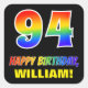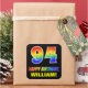 This cheerful, fun, and colourful birthday-themed sticker design features a large number "94" and the message "HAPPY BIRTHDAY,", both coloured with a rainbow spectrum gradient inspired pattern, along with a bold yellow customisable name. The background is coloured black. Fun stickers like this might be used when wrapping gifts being given to somebody in celebration of their 94th birthday, or perhaps maybe be handed out to the attendees at a birthday celebration. [~Z0000480]
