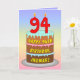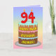 This joyful and colourful birthday-themed greeting card design features a cartoon-style depiction of a three-tier birthday cake having number-shaped candles on top showing the age “94“, along with the message “HAPPY 94TH BIRTHDAY,”, and a custom recipient name. The background of the front has a multicolored pastel rainbow spectrum inspired gradient pattern. The inside features a personalised birthday greeting message, or could perhaps be cleared and left blank if a message is to be written by hand instead. A fun, personalised birthday greeting card like this might be a fun way to deliver some birthday wishes to somebody who is celebrating their ninety-fourth birthday. [~Z0000625]