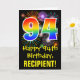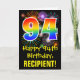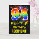 The front of this colorful, fun, and exciting birthday themed greeting card design features a large number "94" with a rainbow spectrum gradient inspired pattern, along with the message "Happy 94th Birthday,", and a personalized recipient name. The front additionally has a colorful background pattern inspired by the look of bursting celebratory fireworks. The inside features a customized birthday greeting message, or could perhaps be cleared and left blank if a message is to be written by hand instead. A personalized birthday card like this might be a fun way to send a message in celebration of somebody’s ninety fourth birthday. [~Z0000442]