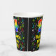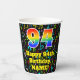 This exciting and joyful music-themed birthday paper cup design features a large number “94” with a rainbow spectrum gradient inspired pattern, along with the message “Happy 94th Birthday,”, and a personalised name. The background features a vibrant and colourful pattern having music notes and symbols of various sizes and colours. Colourful, vibrant paper cups like this might be fun to have at a birthday celebration/party being held to honour somebody’s 94th birthday. [~Z0000541]