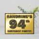 The front of this bold ninety-fourth birthday party foil invitation card features a custom name, a large number “94th”, the message “BIRTHDAY PARTY!”, and a border, all featuring a rustic, yet elegant, faux wood grain look inspired pattern. The back features personalised details about the event, such as the date, time, venue, and any other information that may be important. Editable invitations like these might be used to invite guests/attendees to a birthday gathering being held in celebration of somebody’s 94th birthday. [~Z0000595]