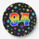 This fun, colourful, and cheerful paper plate design features a large number "94" coloured with a rainbow spectrum gradient inspired pattern. The background features a colourful star shapes pattern. Fun paper plates like this might be used at a celebration being held to observe somebody’s ninety fourth birthday, or a couple’s ninety fourth anniversary, or some other ninety fourth event. [~Z0000493]