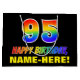 This cheerful, colourful, and fun birthday-themed gift bag design features a large number "95" and the message "HAPPY BIRTHDAY,", both coloured with a rainbow spectrum gradient inspired pattern, along with a bold yellow editable recipient name. The background is coloured black. A fun gift bag like this might be used when giving a gift or present in honour of somebody’s 95th birthday. [~Z0000477]