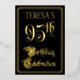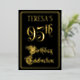 The front of this fancy, luxurious, foil ninety-fifth birthday party/celebration invitation design features the message “95th Birthday Celebration” in elegant script-style text. It also features a personalised name. The background of the front is coloured black by default (although it can be customised to a different colour). The back features personalised details about the event, such as the date, time, location, and any other information that may be relevant. Elegant, opulent, customised invitations like these might be used to invite guests to a birthday celebration being held to celebrate somebody’s ninety-fifth birthday. [~Z0000589]