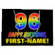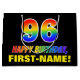 This cheerful, colourful, and fun birthday themed gift bag design features a large number "96" and the message "HAPPY BIRTHDAY,", both coloured with a rainbow spectrum gradient inspired pattern, along with a bold yellow custom recipient name. The background is coloured black. A fun gift bag like this might be used when wrapping gifts being given to somebody in celebration of their 96th birthday. [~Z0000477]