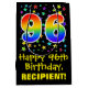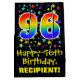This exciting, fun, and colourful birthday giftbag design features a large number "96" with a rainbow spectrum gradient style pattern, along with the message "Happy 96th Birthday,", and a custom recipient name. It also has a background pattern featuring star shapes of various sizes and colours. A gift bag like this might be used when wrapping gifts being given to somebody in celebration of their ninety sixth birthday. [~Z0000510]