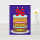 The front of this fun and joyful birthday themed greeting card design features a depiction of a three-tier birthday cake having number-shaped candles on top showing the age “96“, along with the message “HAPPY 96TH BIRTHDAY,”, and a custom recipient name. The inside has a customisable birthday greeting message, or could perhaps be cleared and left blank if a message is to be written by hand instead. An upbeat, customised birthday greeting card like this might be used to celebrate somebody’s ninety-sixth birthday. [~Z0000620]