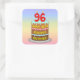 This cheerful and upbeat birthday themed square sticker design features a cartoon-style depiction of a three-tier birthday cake having number-shaped candles on top showing the age “96“, along with the message “HAPPY 96TH BIRTHDAY,”, and a custom recipient name. The background features a multi-color pastel rainbow spectrum inspired gradient pattern. Birthday themed stickers like these might be given out or used at a birthday party celebrating somebody’s ninety sixth birthday, or perhaps used when preparing invitations or wrapping gifts/presents for such an event. [~Z0000624]