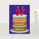 This upbeat and fun birthday themed greeting card design features a depiction of a three-tier birthday cake having numeral-shaped candles on top showing the number “97“, along with the message “HAPPY 97TH BIRTHDAY,”, and a personalised recipient name. The inside has a customisable birthday greeting message, or could perhaps be cleared and left blank if a message is to be written by hand instead. A joyful, personalised birthday greeting card like this might be sent in celebration of somebody’s ninety-seventh birthday. [~Z0000620]
