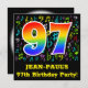 The front of this fun, vibrant, and colourful birthday party invitation design features a large number "97" with a rainbow spectrum gradient inspired pattern, along with a customisable name and the message "97th Birthday Party!" Part of the background features a fun pattern of various music notes and symbols having a variety of colours and sizes. The back features editable information regarding the event that the potential guests are being invited to. Vibrant, personalised birthday celebration invitation cards like this might be sent to potential guests of a gathering being held to honour a song composer’s, a singer’s, a musician’s, or somebody else’s 97th birthday. [~Z0000427]