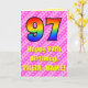 The front of this festive and upbeat 97th birthday-themed greeting card design features a large number "97" having a colourful rainbow spectrum inspired gradient pattern. It also features the message "Happy 97th Birthday,", followed by a personalised recipient name. The background of the front features a cheerful pattern of dark pink and light pink stripes containing loving pink heart shapes. The inside features a customised birthday greeting message, or could perhaps be cleared and left blank if a message is to be written by hand instead. A personalised birthday card like this might be a fun way to send birthday wishes to somebody who is celebrating their ninety seventh birthday. [~Z0000416]