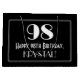 This Roaring '20s style inspired vintage appearance birthday themed gift bag design features a large art deco look inspired number "98", the message "Happy 98th Birthday,", a custom name, and a border pattern consisting of thin lines. It also has a black-coloured background. A birthday themed gift bag like this may be used to wrap a gift or present being given to somebody who is celebrating their ninety eighth birthday. [~Z0000496]