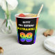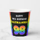 This fun and bold birthday themed paper cup design features a large number “98“ having a multicolor rainbow spectrum inspired gradient pattern, along with the message “HAPPY 98th BIRTHDAY,”, and a custom recipient name. Birthday themed paper cups like this might be fun to use at a birthday party being held for somebody who is celebrating their 98th birthday. [~Z0000639]